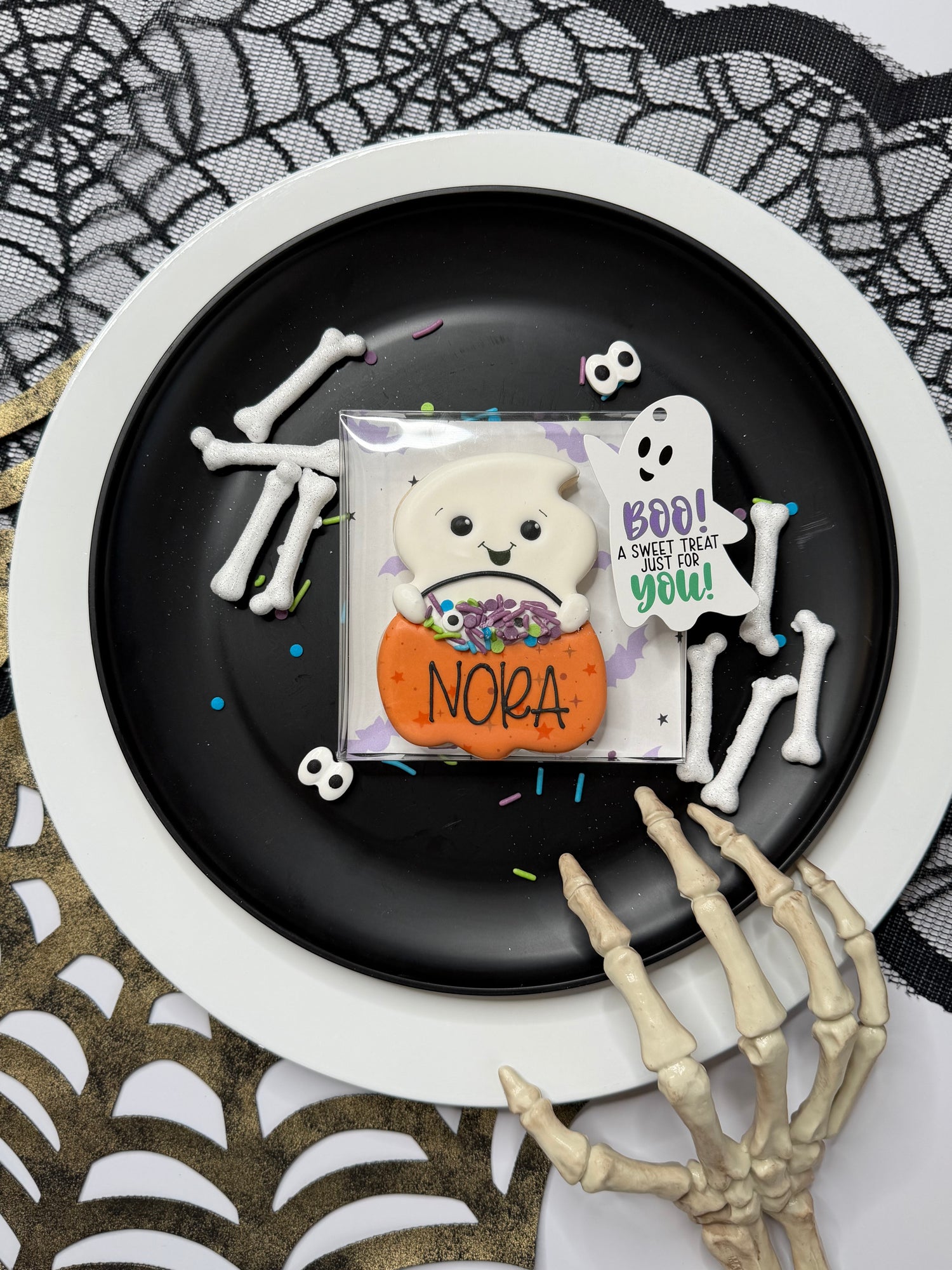 No Tricks just Treats! Treat your little Ghost this Halloween with a personalized full sized cookie (4in) in your choice of flavors: Signature Sweet Almond or Classic Vanilla. Cookies will be in a heat-sealed bag to maintain freshness and packaged in a gift box with a bow and Halloween gift tag.